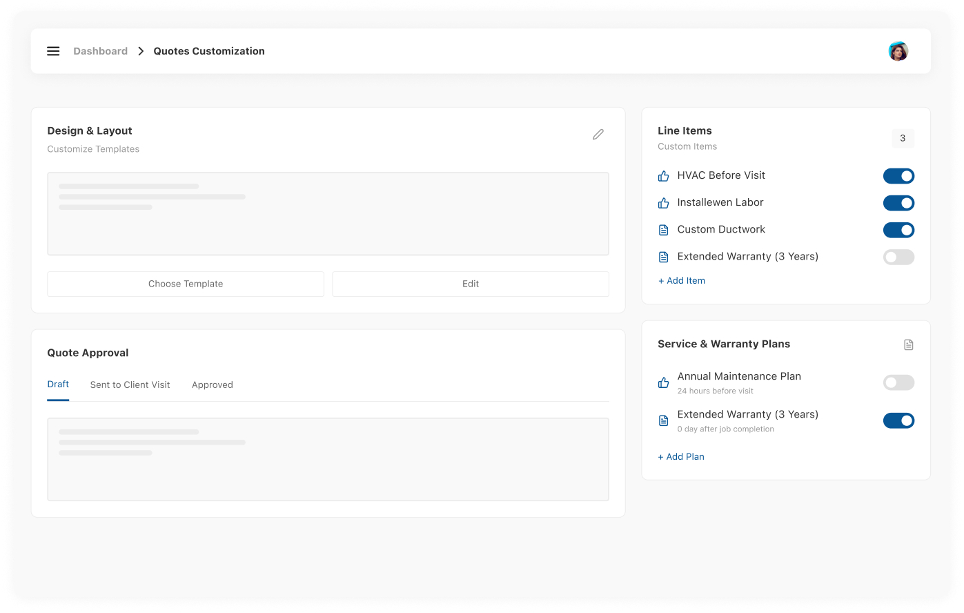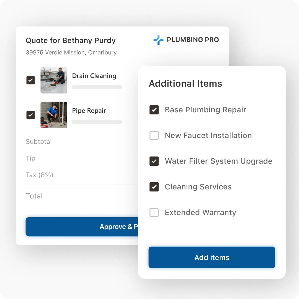Create modern, easy-to-read quotes that help customers say “yes” faster. Present clear pricing, optional upgrades, and service plans — all designed to increase trust, transparency, and conversion rates.