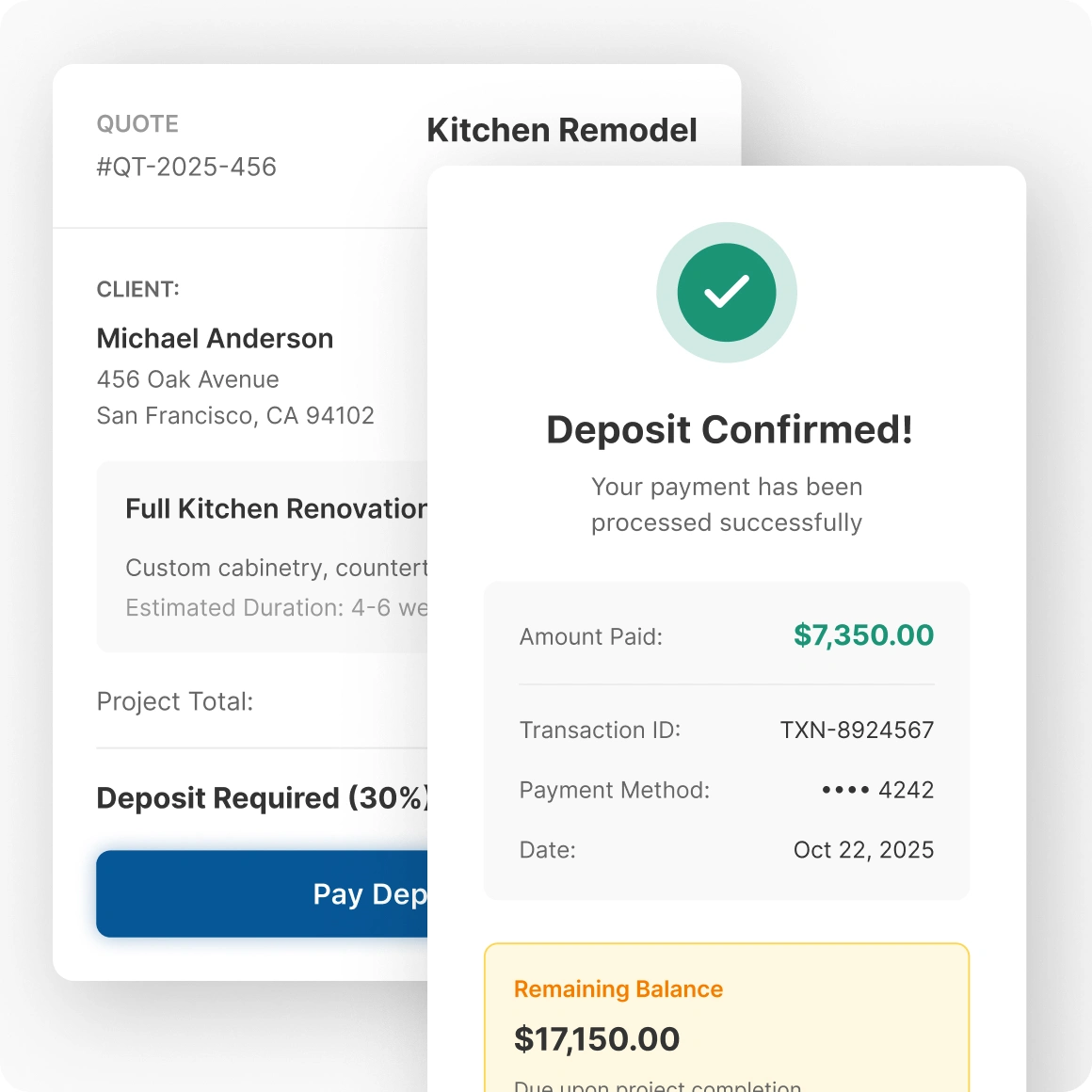 Give clients a seamless way to approve quotes and submit deposits the moment they’re ready. Improve cash flow, reduce no-shows, and ensure every job starts with full client commitment.