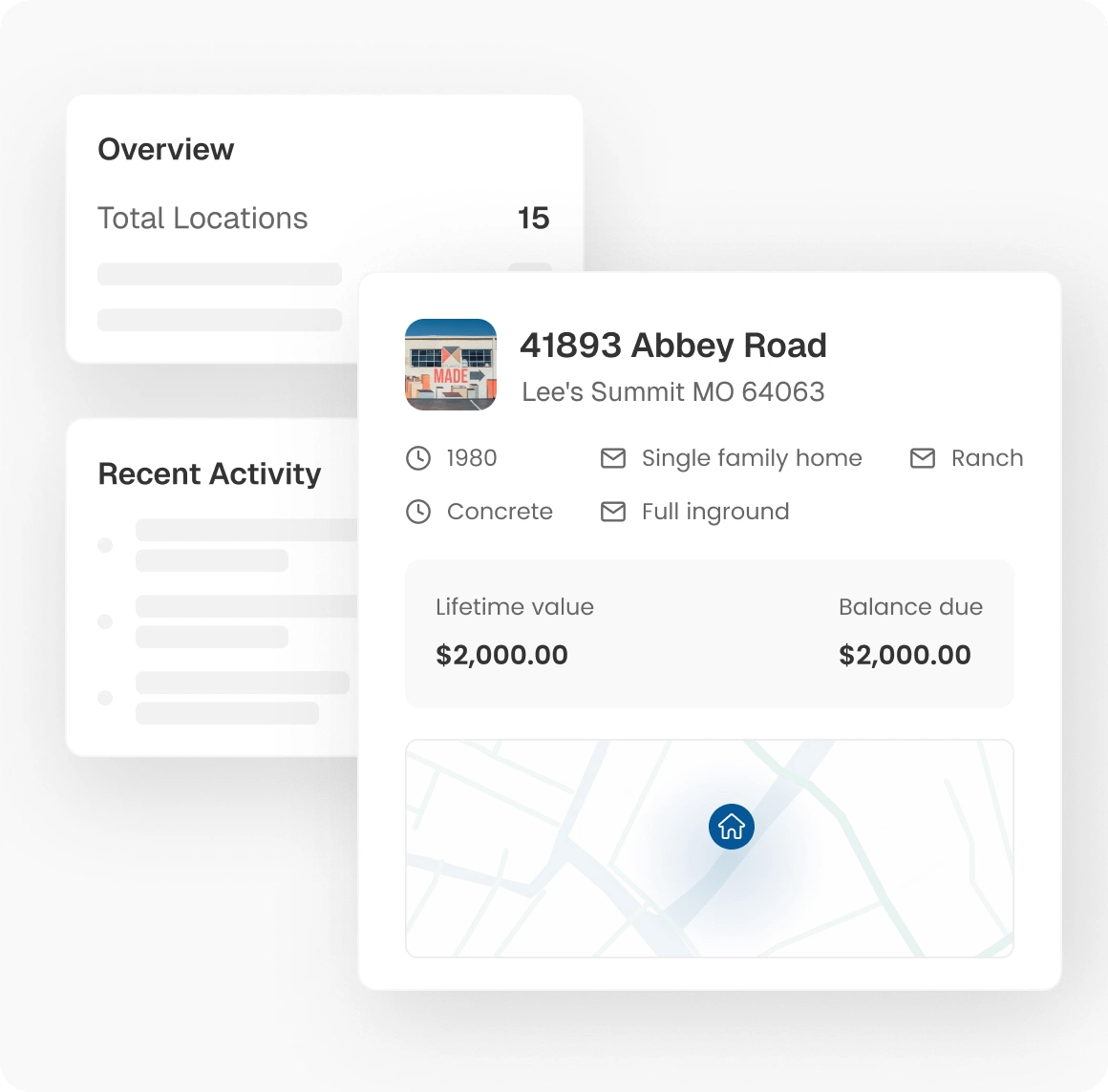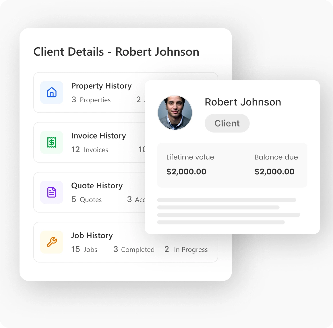 Get a complete 360-degree view of every client. Instantly access contact information, property details, work history, notes, and outstanding balances—all from one organized profile. Everything your team needs to deliver faster, more personalized service.
