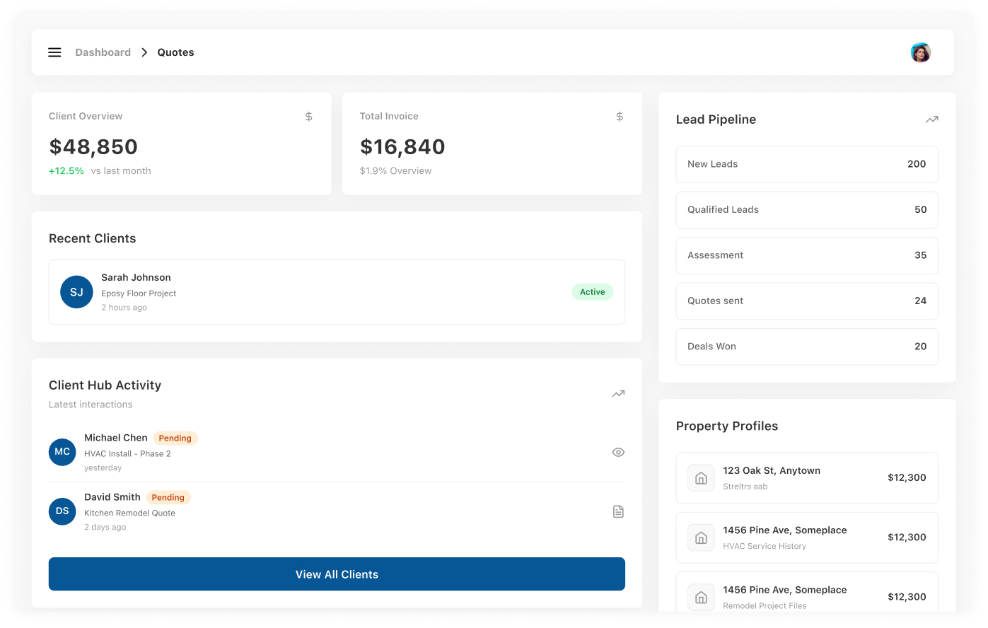 Easily track leads, quotes, and customer activity from first inquiry to final invoice. Get full visibility into your pipeline, boost follow-ups, and keep deals moving forward with a CRM built for growing service businesses.