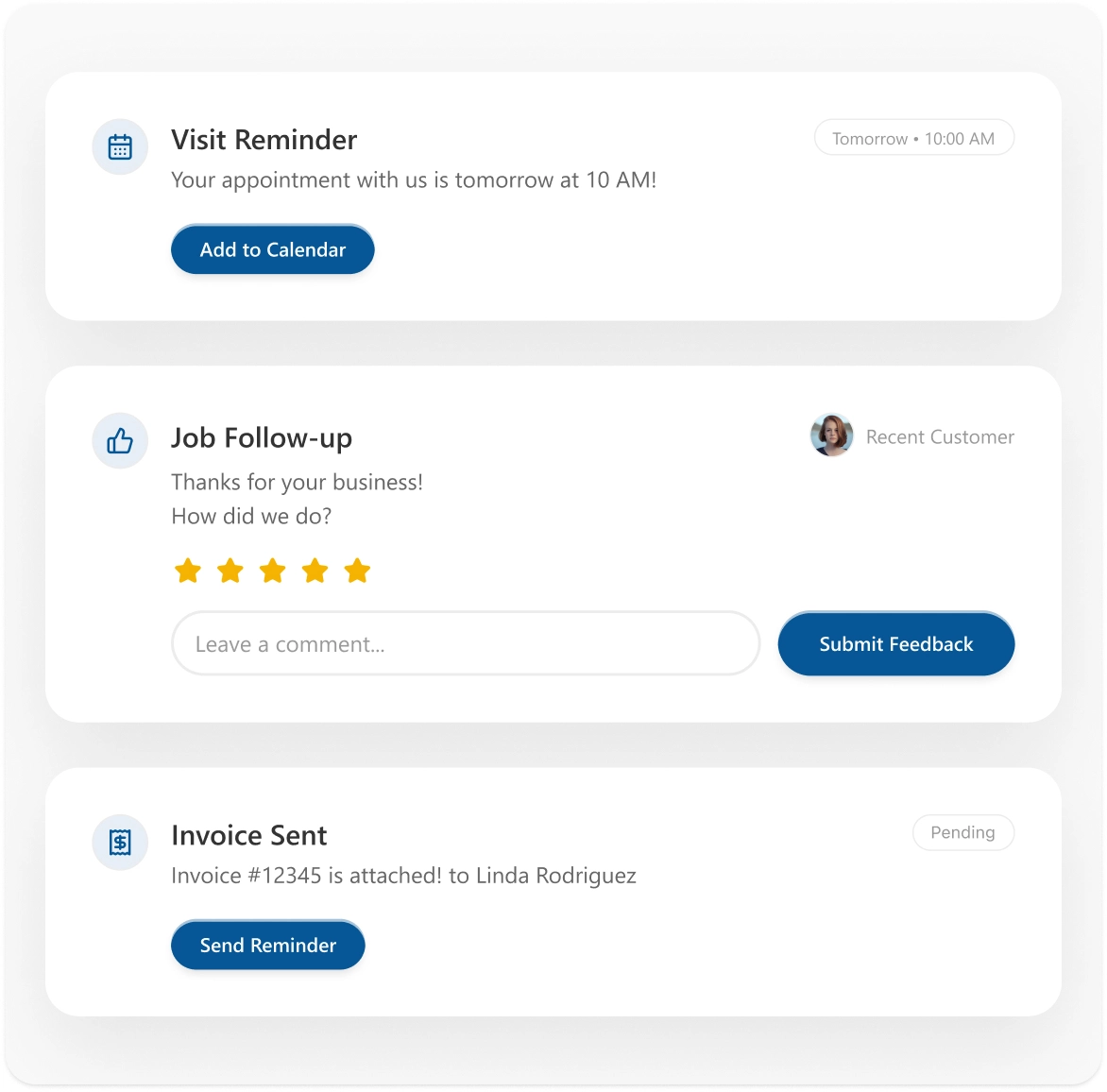 Automatically send friendly, professional reminders to customers before their scheduled visit. Reduce missed appointments and ensure your day runs smoothly.